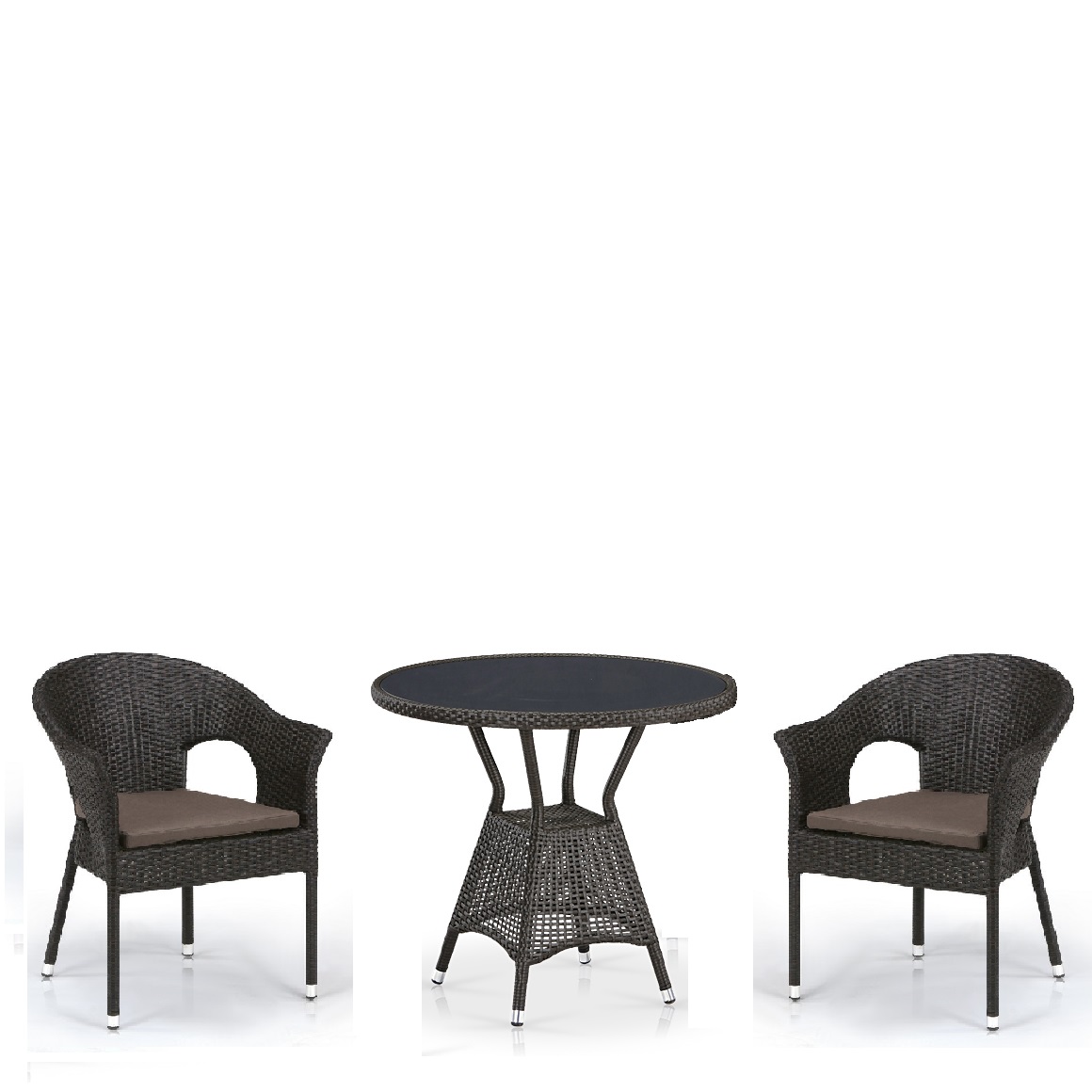 Стoл: D80xH74 см. Стекло: закаленное- 5мм, стекло внутри столешницы, цвет - черный. Кресло: W62xD60xH82 см. Каркас: труба сталь. Материал: искусственный ротанг. Подушки в комплекте Цвет: Коричневый